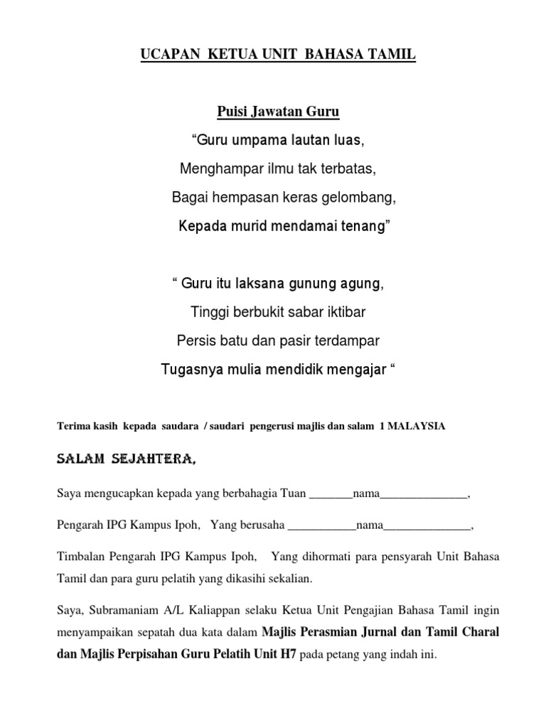 Ucapan Ketua Unit Bahasa Tamil Pdf