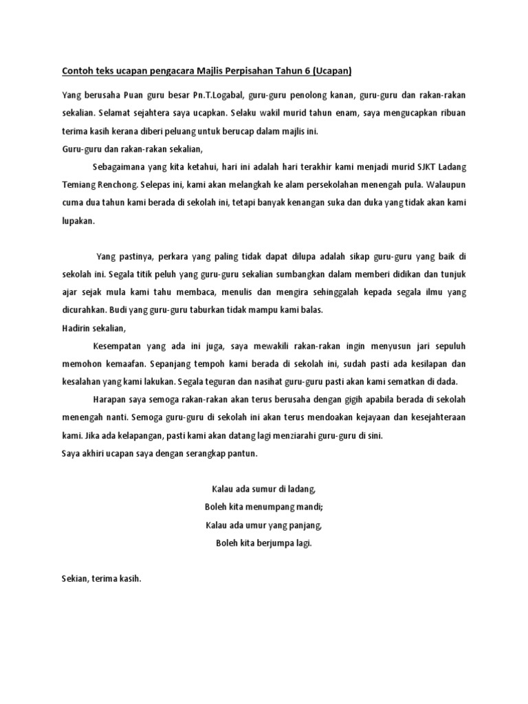 WONG PENGURUS BESAR LPPB DI SHANGRI-LAS TANJUNG ARU RESORT PADA 2HB MEI 2008 JUMAAT JAM 715 MALAM Assalamualaikum Warahmatullahi. Walau bagaimanapun saya kongsikan Contoh Teks Ucapan Sempena Majlis Perpisahan Tabika Perpaduan untuk rujukan pada masa hadapan. Contoh Teks Ucapan Perpisahan Guru.